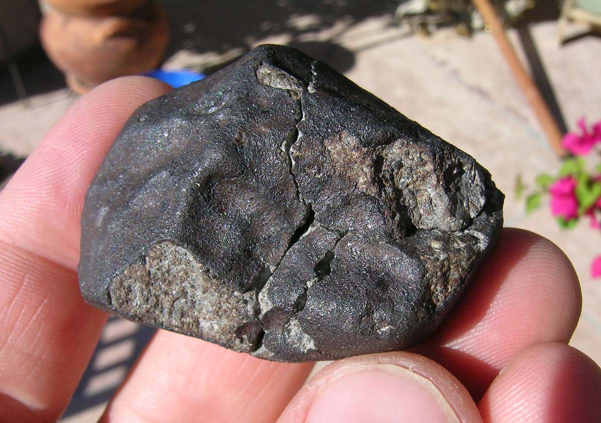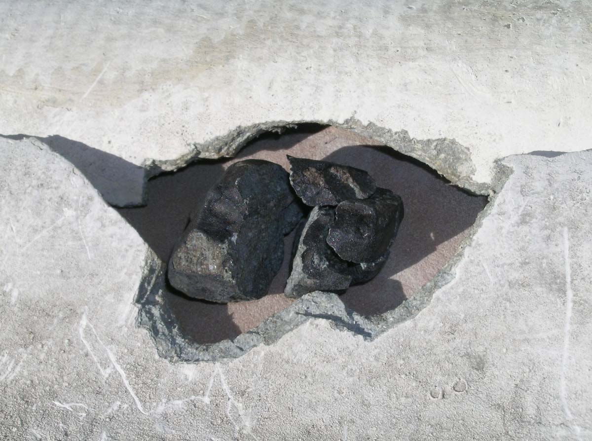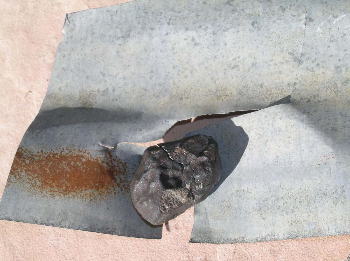 This photo shows the Cali 001 meteorite pieces assembled on top of the metallic rooftop which was also penetrated by this meteorite. The metal sheet was laying on top of the ceramic tile, so it just smashed through the metal. The metallic rooftop piece was sold along with the second largest piece of this specimen to a private collector. |