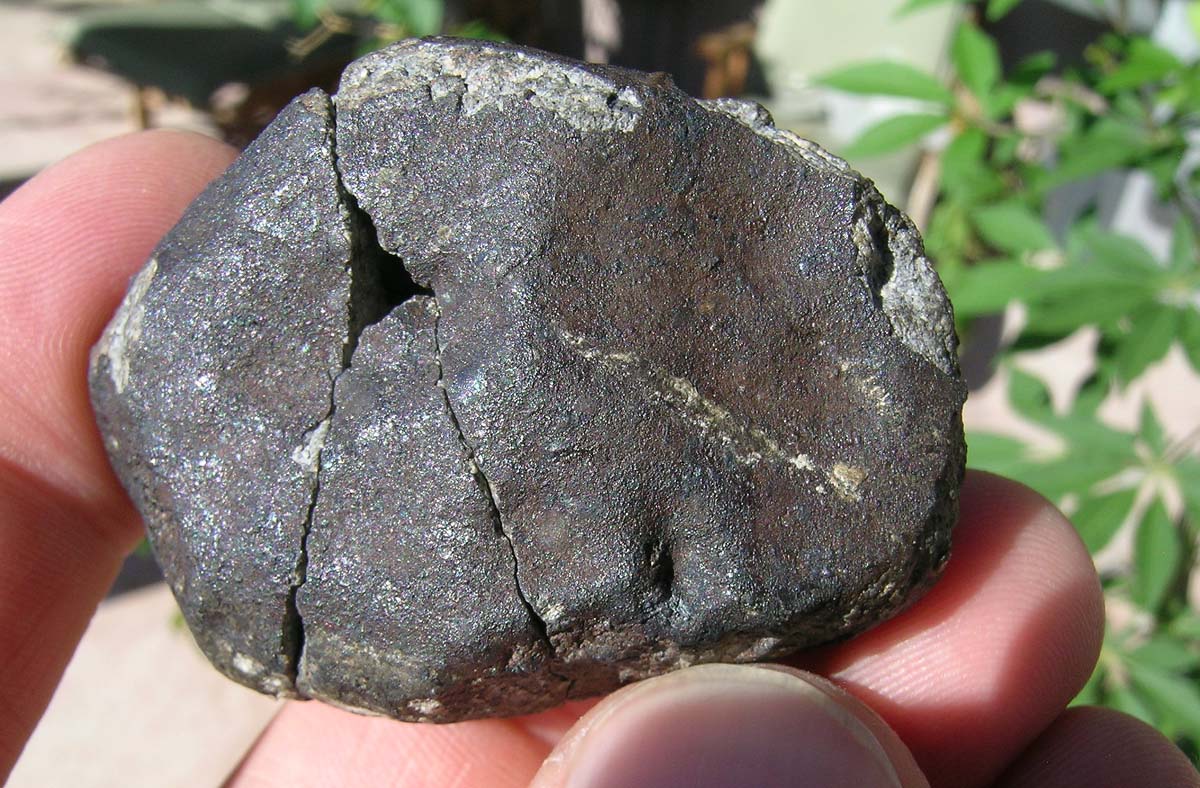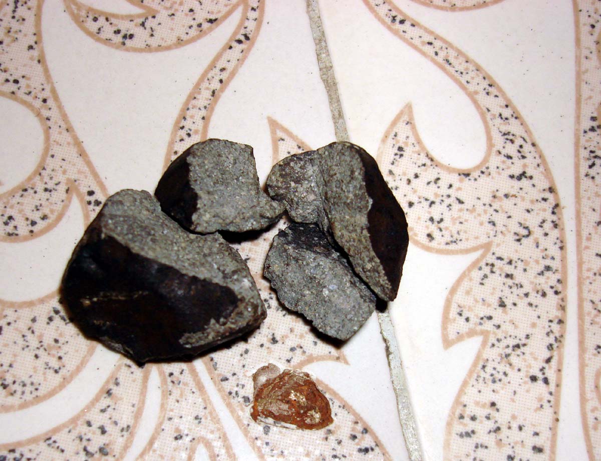 Cali #001N0323.946 W07631.022 EXACT WEIGHT of this stone was 76.6 grams. This stone impacted the home of Yuly Melecio in the Barrio Mariano Ramos neighborhood of Cali. She lives on the second floor of a building and the stone impacted her rooftop and penetrated both the zinc metal and ceramic roof tiles. She was at home at the time, and heard a sound like thunder outside. She told her son who was outside on the back balcony to come inside, as she thought a storm was coming. Moments later, a loud crash shook the home and when she went into the bedroom, she saw pieces of stone and roof tiles on the floor. There was sunlight shining through a new hole in the roof and the floor tile had been chipped by the meteorite. On the
