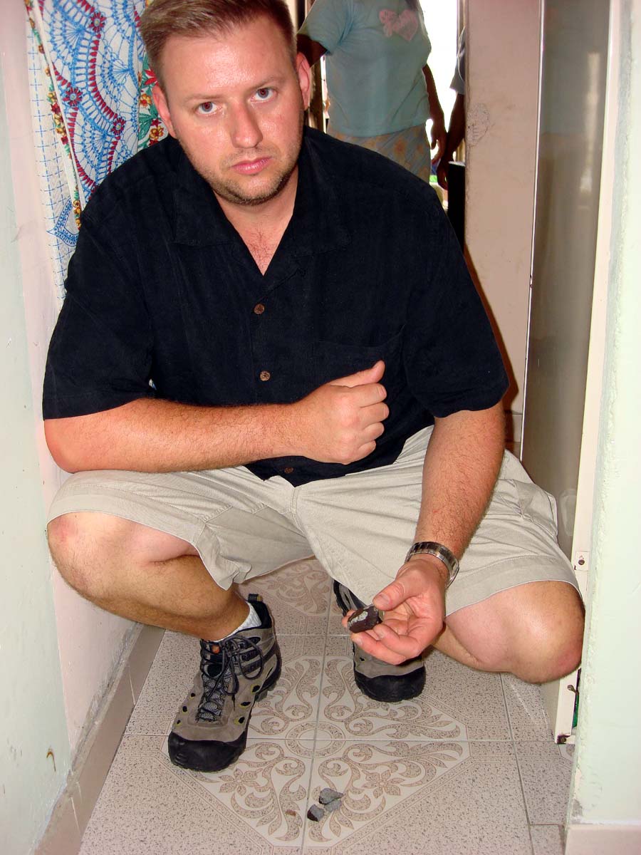 Myself and the pieces of the Cali #001 meteorite with the floor damage visible.