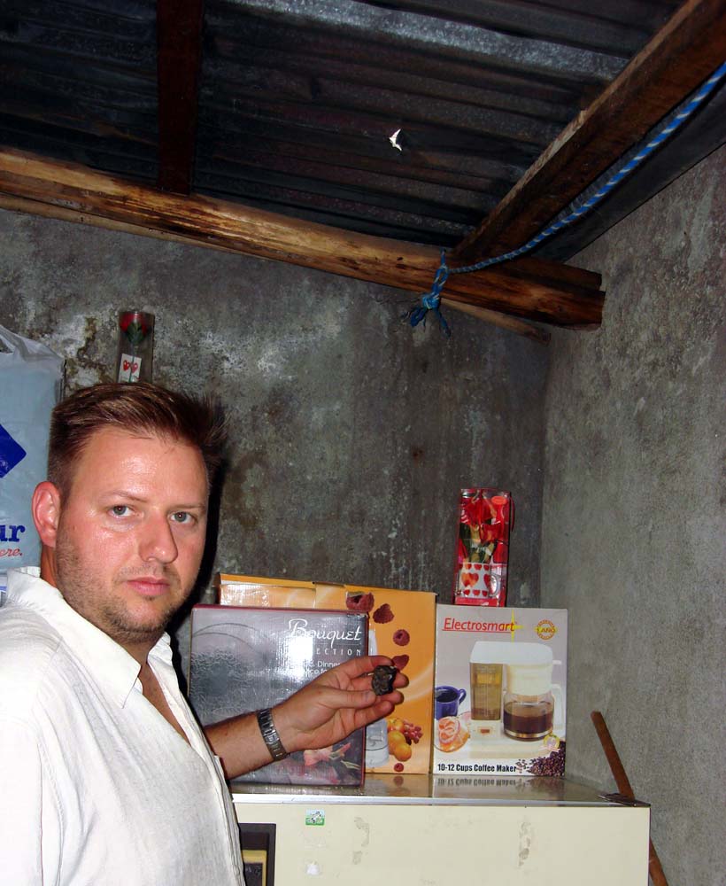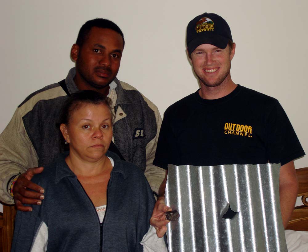 Here you can see a very happy Robert and his new meteorite and rooftop. The homeowners had just sold him the meteorite for half a year salary. It is sure a good thing for all of us that they did not throw the meteorite in the trash like they thought about doing immediately after the fall!