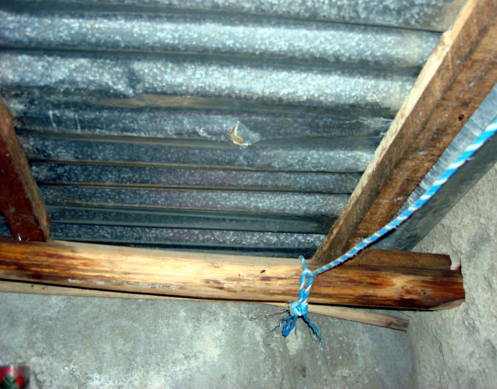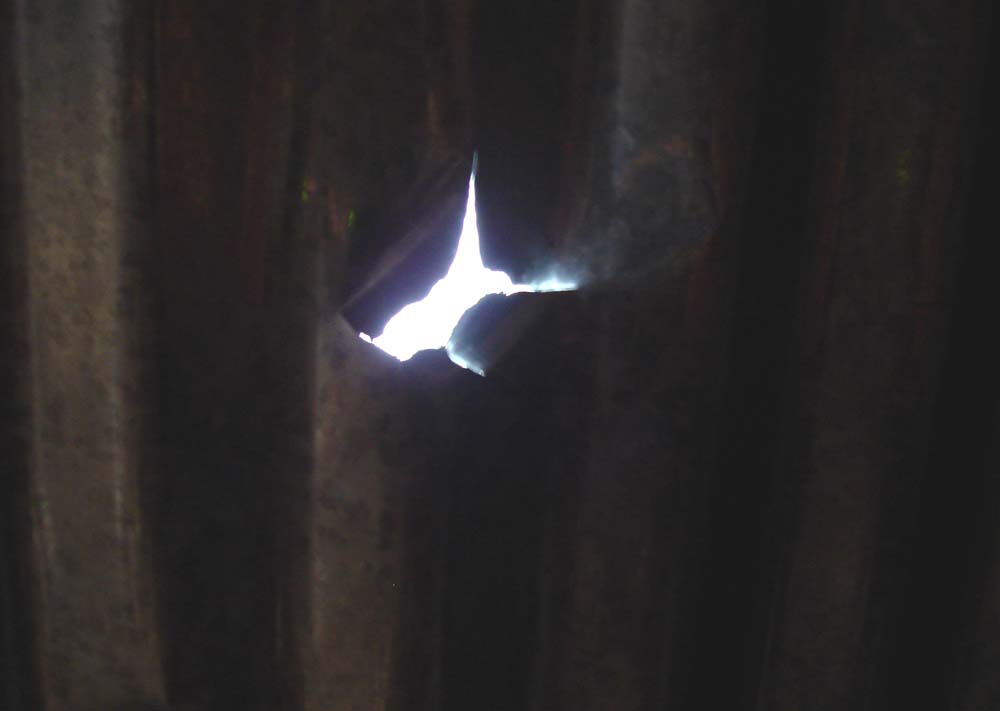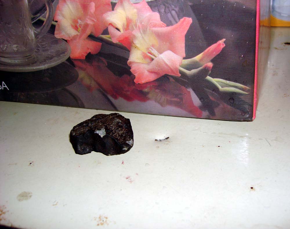 ![]() Another view of the damage caused by the impact of the Cali #003 meteorite. From examinations of the hole, we can tell that the stone entered lengthwise, with one end hitting the roof, and there is matching damage on the point of the stone.
