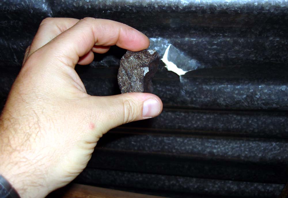 This photo shows the meteorite in my hand, and the impact hole