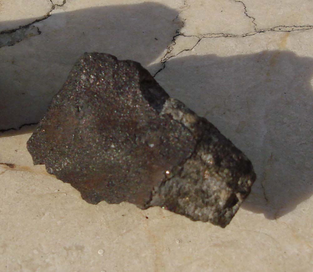 The Cali #006 meteorite. It is a broken fragment weighing ~7 grams. It was found in the street gutter, and it not weathered at all. Despite further searches, the rest of the stone was not found.