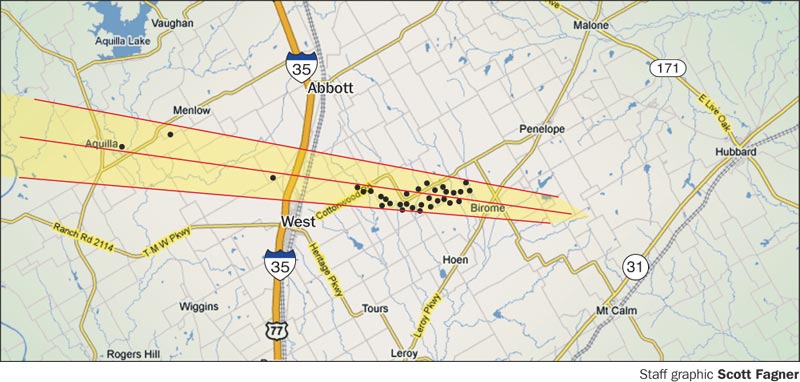 The image above is from the March 17 edition of the Waco Herald Tribune. It is the approximate flight path and cone of the strewnfield showing areas where we found meteorites. Pieces were found all the way to the start point on the right hand side but they did not show pieces there. You can also see clearly where three pieces were found on the west side of the interstate I35. This map while not exact, gives a good idea what a strewnfield looks like and how I narrow down possible hunting areas.