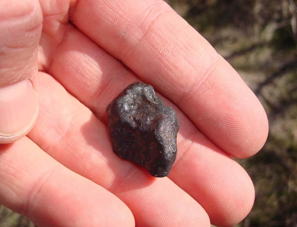 This is a close-up of a small stone I found, showing the typical black fusion crust on stones that have never been rained on. We were fortunate to get nearly a month to hunt the strewnfield before the first rains came and damaged the stones. Almost all Ask Creek stones found were pristine, undamaged by rain and most exhibit a fusion crust that is as good as it gets. I personally found a total of 20 stones, and purchased many more, including a 1.5 kilogram stone found near Aquilla by a landowner. Ash Creek is a meteorite fall that will go down in memory as a great time, a difficult hunt where you were lucky to find one stone every other day or so, they never came easy. Most stones were small, under 20 grams, and they were so hard to find that most collectors preferred to keep all they found. I gave two stones away, and exchanged with museums 4 other stones I found, the other 14 stones I am keeping in my collection.