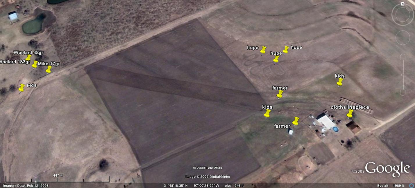 The Google Earth map above is a partial list of stones found me and my group. It is nowhere near complete, and although I tried to assemble a map of stones found by competitors, there were too many and it was impossible to coordinate so much data and hunt meteorites. The map represents much of the center of the strewnfield, it extends to the east at least two miles past my last point and to the west all the way to the town of Aquilla more than 6 miles past my last point in the town of West. At the far left on the map you can see a point, this was a 130 gram stone which hit the roof of a house and bounced off. I tried everything to buy that stone, to no avail. No other stones were found near it despite intensive searching.