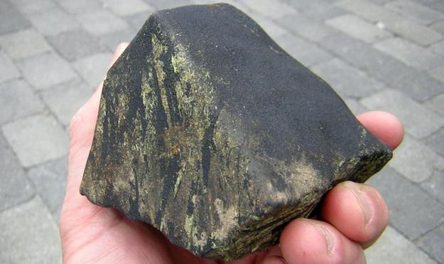 676 gram 100% complete Moss meteorite which penetrated the roof of the Norgesgruppen warehouse in Moss. Photo courtesy of the Aftenposten newspaper. This meteorite is now in the Norway National meteorite collection in Oslo.