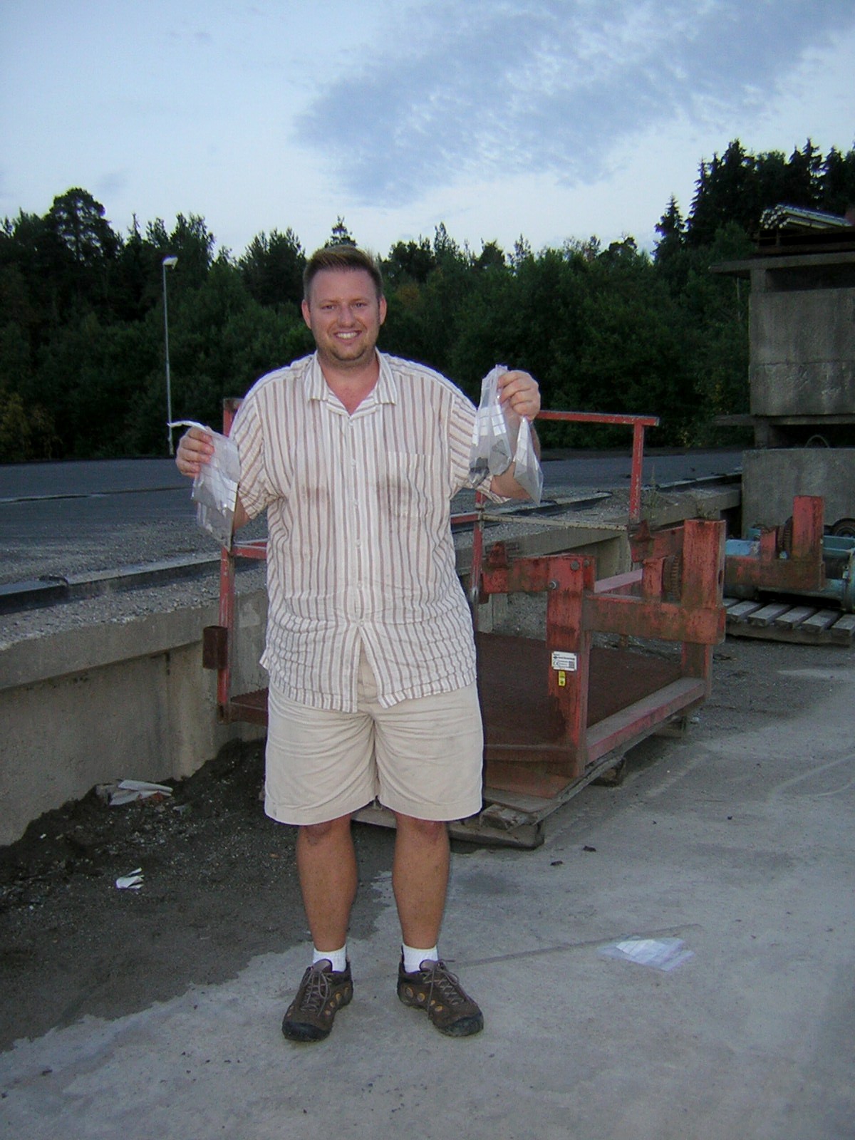 At this time I was in Arizona, planning a trip to Sweden to hunt for Muonionalusta iron meteorites only two weeks away, so I rapidly changed my tickets and diverted to Norway to hunt for the Moss meteorite. Robert Ward, Bob Haag and I flew to Norway and met up with Moritz Karl who had driven from Germany and Morten Bilet, a Norwegian meteorite collector who lives in the area. We arrived and I drove to Moss, a little over an hour from Oslo, and it turns out that our hotel was directly in the center of the strewnfield. Many other people from Europe arrived at the same time, several Germans, a team from Poland, Swedes, British, and Italians. A couple of days after we arrived, we saw fragments of a large piece that weighed nearly two kilograms. The piece had landed and shattered in a yard and was bought by Norwegian and Canadian hunters. After seeing those fresh pieces, we were so excited to be hunting such a rare meteorite. We searched franticly for meteorites day after day, hunting in dense forest in the seaside community. The name Moss is no joke, every inch of ground was covered with a thick carpet of moss plants, making the search for meteorites very difficult. Further complicating the search was the time of year, July and August is when almost all Norwegians take vacations, so most people were not there making it difficult to secure permission to hunt yards and clean properties. After a week, most of the hunters had given and gone home up due to so little suitable ground to hunt and no finds. Morten Bilet and I on the second to last hunting day I had, 30 July, decided to drive around in the town area where the piece had hit the tree, and search parking lots and other areas. It was a Sunday, so the town was very quiet and as we drove, we went into an industrial area, where we thought the large parking lots and storage yards might provide some good searching ground. We saw a factory that produces cement poles for utilities, and it was a large clean area to hunt. As we drove up a dirt road to an underground building with a ground-level rooftop, I got out of the car to check the rooftop for damage. As I was standing there looking over the rooftop, Morten Bilet yelled "Mike, a piece"!