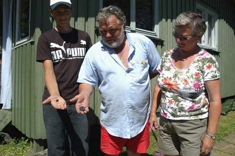 Ragnar Martinsen and family holding pieces of the Moss meteorite which impacted a piece of tin laying on the ground outside of an outdoor toilet while he was using it! Photo by Morten Bilet in Moss-Avis newspaper. A day later the Johansen family returned to their home in Moss, and while mowing the lawn, the father noticed a limb broken off of a cherry tree in his yard and a hole in the ground next to the tree. He saw a 752 gram complete black stone laying on the ground next to the hole. He had seen the news about the meteorite fall and photos of the first stone, so he knew that this stone was a meteorite. Read an article in Norwegian news about this stone. CLICK HERE