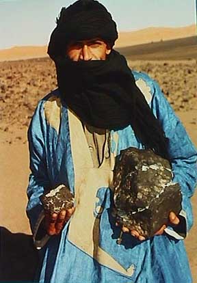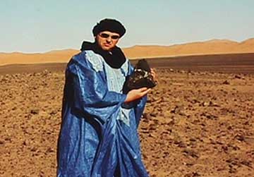 METEORITE ADVENTURES: BENSOURMarch 2002, Morocco Bensour in an LL6 breccia, fell on Feb 10, 2002 at approximately 4:00 pm in eastern Morocco and western Algeria. Several hundred small stones fall, the largest being a 9.2 kilogram individual which broke into 3 large pieces on impact. This piece and several other large ones of over 1 kilos landed in Algeria, just across the border from Morocco. The smaller stones mostly landed in Morocco. The strewnfield was about 5 kilometers long and quite compact. I went to Morocco on March 13th, one month after the fall and bought most of the entire fall. A few kilos had already been shipped to other dealers but the majority was still there. In 48 hours, and about 500 miles of driving, I scored big on this one! This was a very successful meteorite