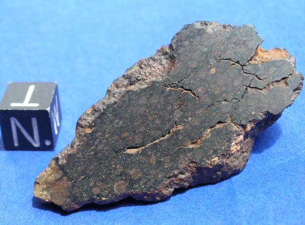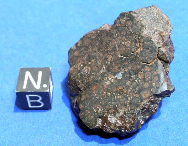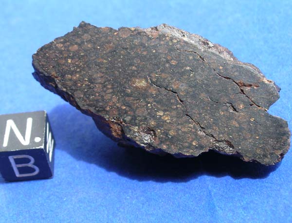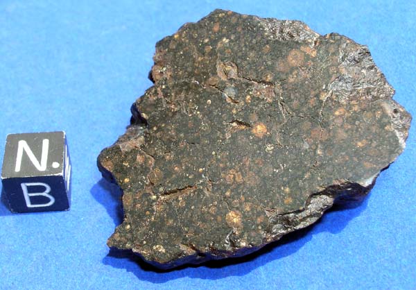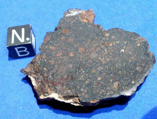 NWA 1934This meteorite is classified as a Carbonaceous chondrite (CV3). It was found in Morocco/Algeria in 2003. The total known weight of this meteorite is ~8 kilograms. I bought it all and have over the years sold off much to universities and collectors. Recently scientific study has revealed some interesting features in this meteorite with regard to the CAI's (Calcium Aluminum Inclusions). Some good papers about this should be out in the next few years. The meteorite is very old, only in broken fragments and no trace of fusion crust. The chondrules are oddly smashed usually flattened. There are blue Hibbonite crystals in the CAI's. This is a nice rare carbonaceous chondrite suitable for collectors and scientists.