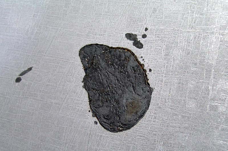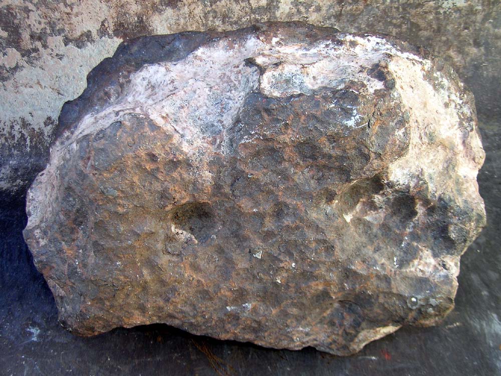 This photo shows the bottom of the Zaragoza meteorite before cutting. You can clearly see that this part was under the ground with the soil-level clearly showing that about 50% of the meteorite was protruding above the surface. |